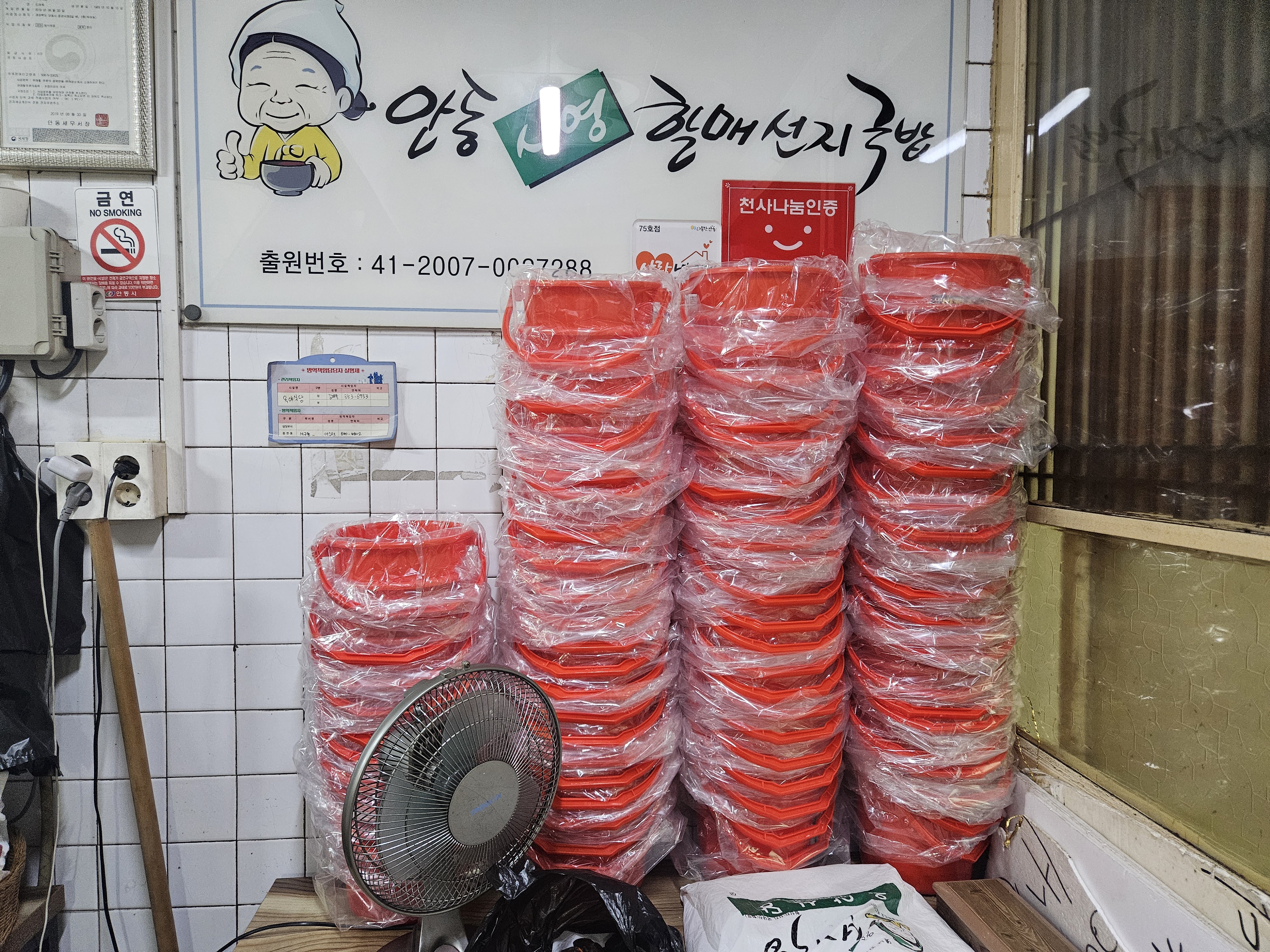 이곳의 대표 메뉴는 단연 선지해장국입니다. 보통 그릇 단위로도 판매되지만, 더 유명한 건 빨간 플라스틱 통에 담아 판매하는 대용량 해장국입니다. 한 통에 약 5인분 이상이 들어 있으며, 농촌에서는 이걸 사다가 일꾼들 새참으로 나누어 먹는 전통이 이어지고 있습니다.